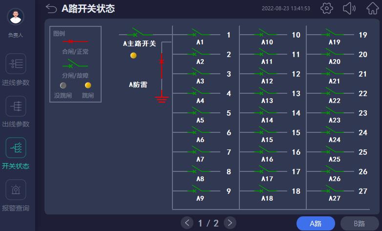 左側一列為主路開關狀態,主路跳閘SD狀態、主路防雷開關狀態、主路防雷故障點狀態,默認為無源檢測點,分閘為綠色,合閘為紅色。主路右側的皆為支路開關狀態;默認為有源檢測點,合閘為紅色,分閘為綠色。