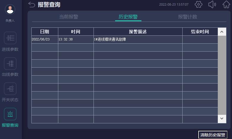 開機進入主頁,包含進線參數、開關狀態、出線參數、報警查詢等功能,按按鈕可進入各功能界面查看。